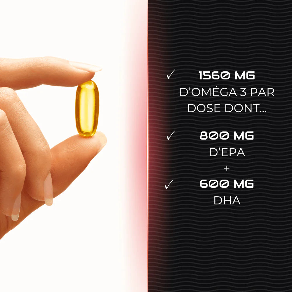 Chaque dose apporte 1 560 mg d’oméga-3 (800 mg d’EPA + 600 mg de DHA) issus de l’huile de poisson purifiée sous label Epax®, référence mondiale en qualité et pureté. Grâce à un indice TotOx de 2, cette huile est sans odeur et ne provoque ni renvois ni inconfort digestif. Une solution experte pour un apport efficace en acides gras essentiels.