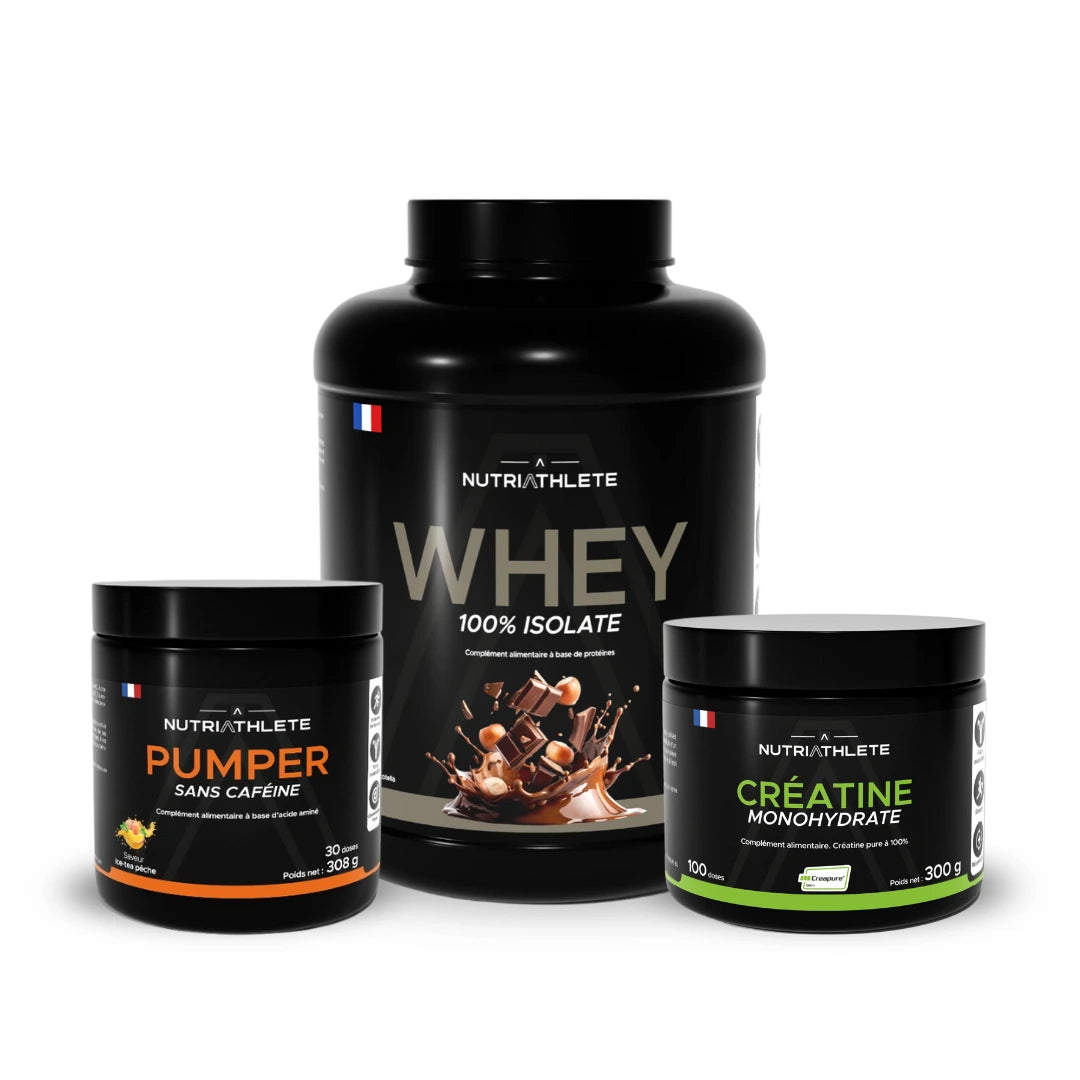 Le Pack Performance NutriAthlète combine whey, Pumper et créatine pour t’accompagner avant, pendant et après tes entraînements.