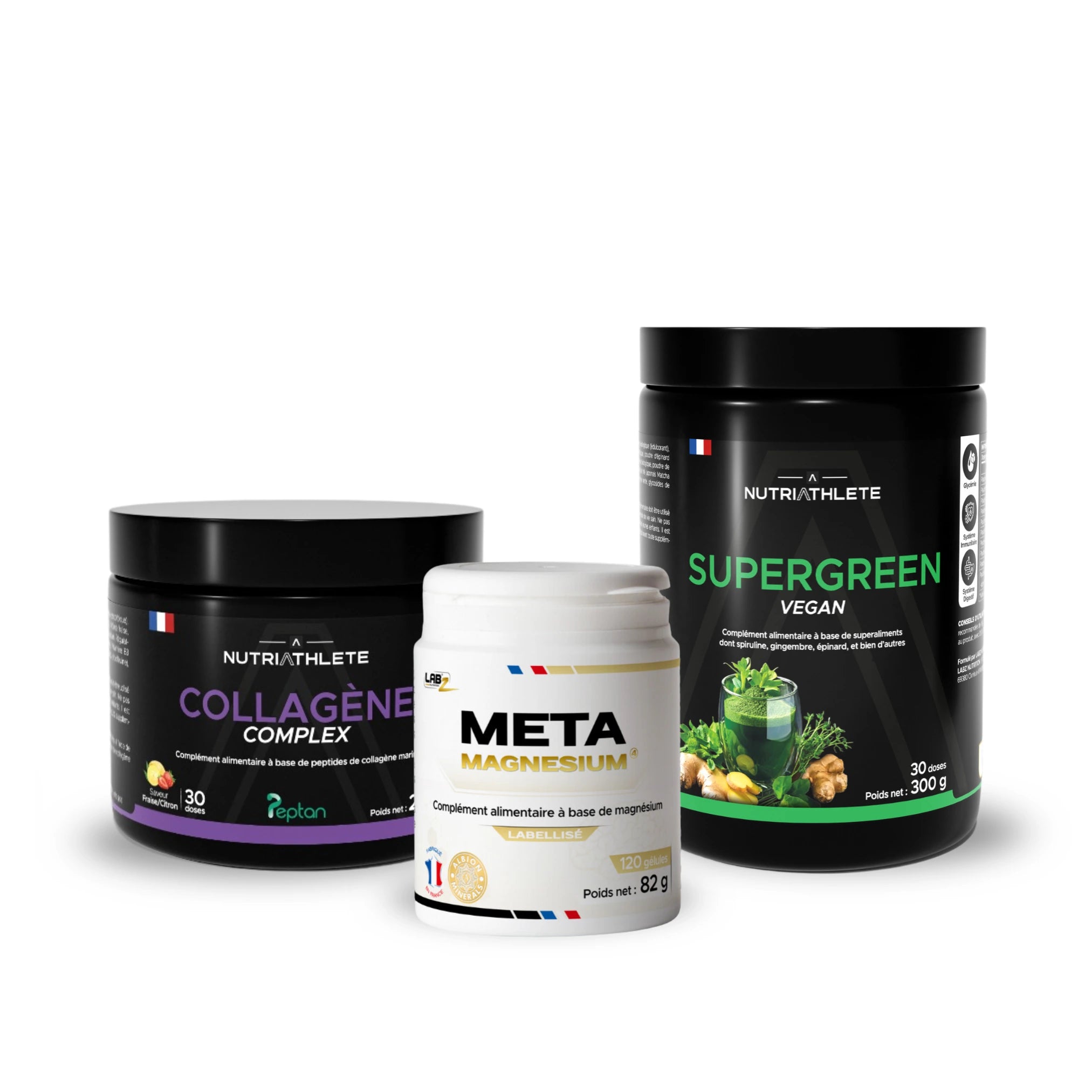 Le Pack Énergie & Bien‑être réunit Collagène Marin, Supergreen et Meta Magnésium pour un soutien complet de votre organisme au quotidien.