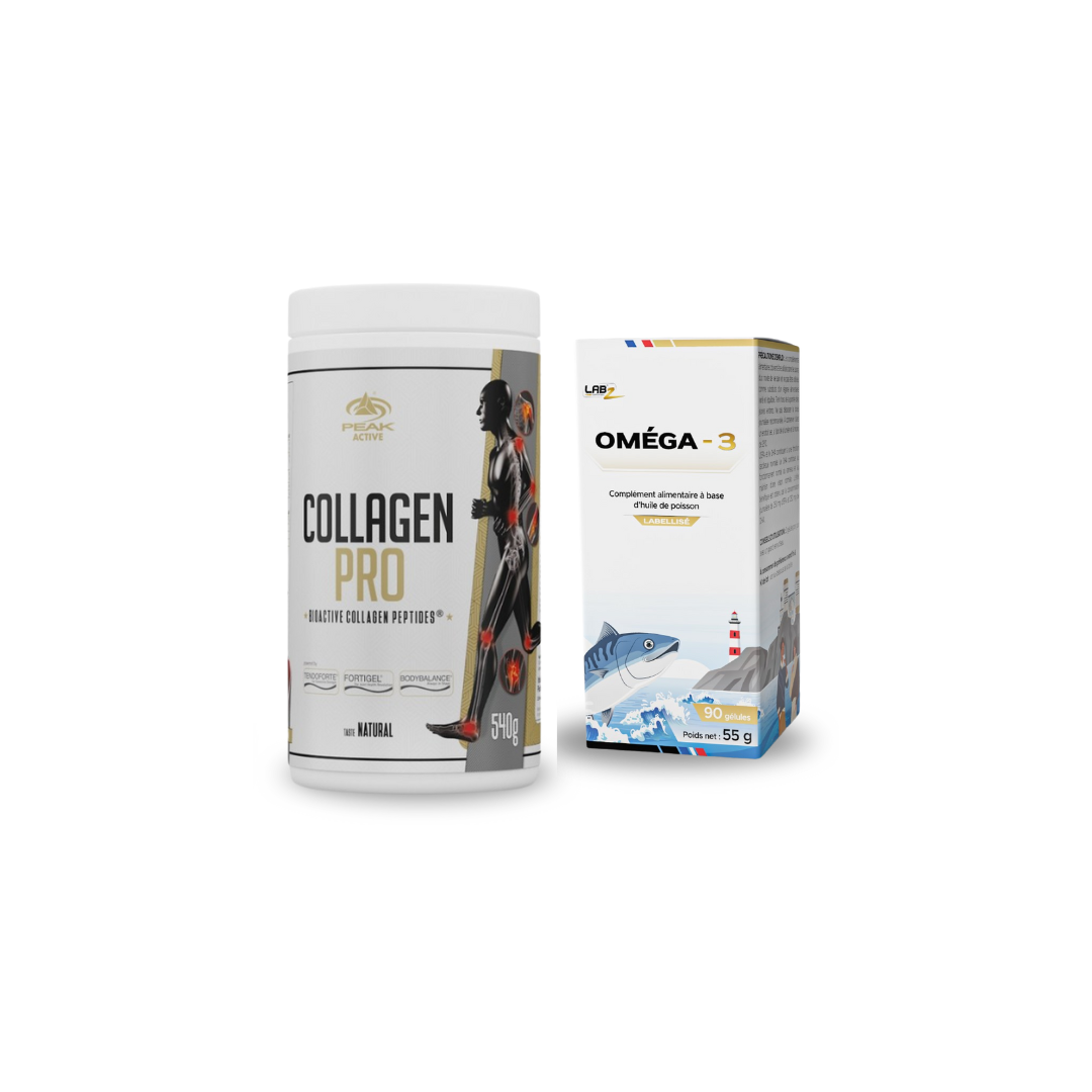 Ce pack réunit le Collagen Pro®, une source hautement biodisponible de collagène, et les Oméga-3 Labz Nutrition, des acides gras essentiels d’origine marine. Ensemble, ils agissent en synergie pour contribuer à la réparation des tissus conjonctifs, soutenir la structure du cartilage et favoriser une réponse anti-inflammatoire naturelle.